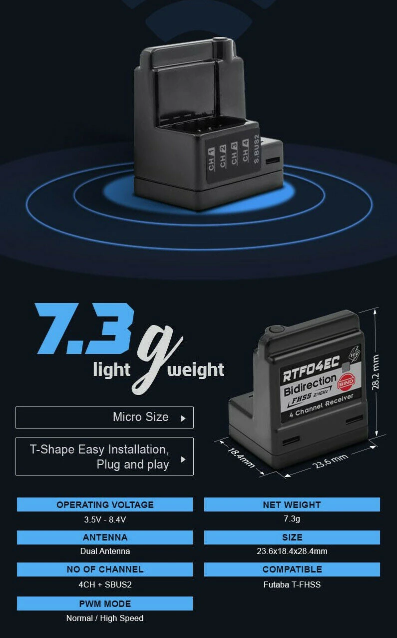 The RTF04EC affordable FUTABA T-FHSS compatible receiver is made in T-shape, built-in antenna and full channel 4CH+S.BUS2, it is available to connect to 1-2s lipo. Bidirectional communication makes it easy to bind by automatically locking into the correct transmitter and save the record. It is suitable for all types of RC cars.